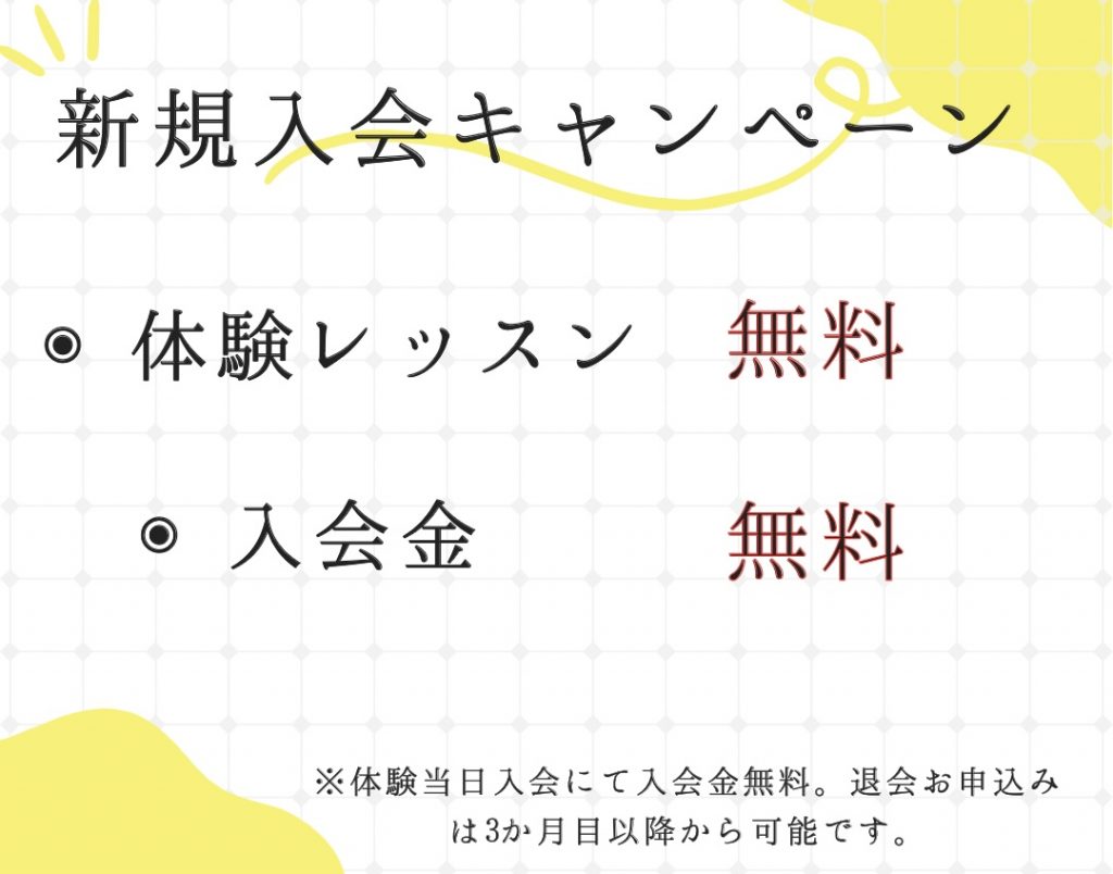 ※体験当日入会にて入会金無料。退会申込みは3か月目以降から可能です。